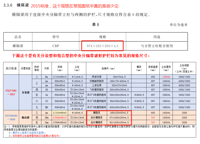 4、原2015三波護欄標準中的橫隔梁刪去,現行的有關中央分隔帶橫隔梁的標準可以參考:團體標準T/CCTAS162—2024《公路中央分隔帶組合型波形梁護欄技術規程》;