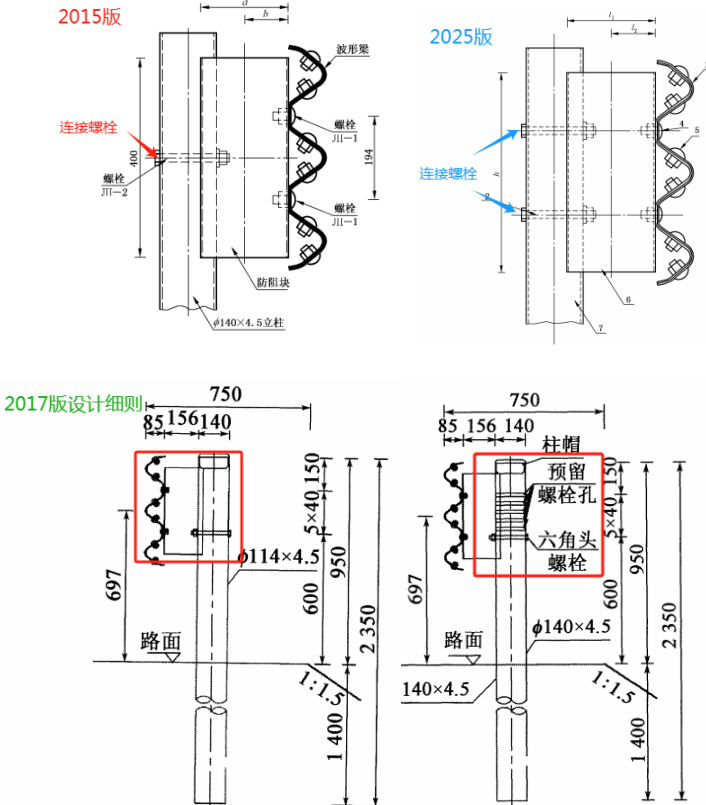 其實2015版圖紙設計是一個長螺栓,安裝在三波護欄的正中點其實是很穩固的,但有很多路段后期可能需要調整護欄的高度,所以在2017版《公路交通安全設施設計細則設計》時要求打預留孔,在安裝時螺栓穿過最下面的孔顯得不是那么穩固,所以在2025版波形護欄規范要求中又增加了一個螺栓,兩點固定可以使安裝更加的穩固。