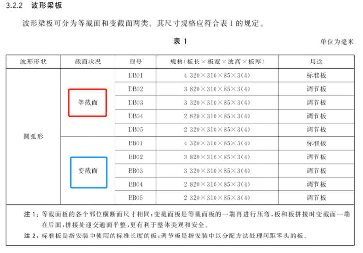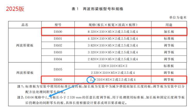 在即將實施的2025版標準中刪除了變截面兩波形梁板的外形圖及加工要求,只保留了等截面板DB這一種板型,且增加了厚度2mm和2.5mm護欄板的最小厚度和平均厚度要求,更改了兩波形梁板外形圖、橫截面公稱尺寸、展開尺寸及允許偏差。